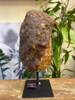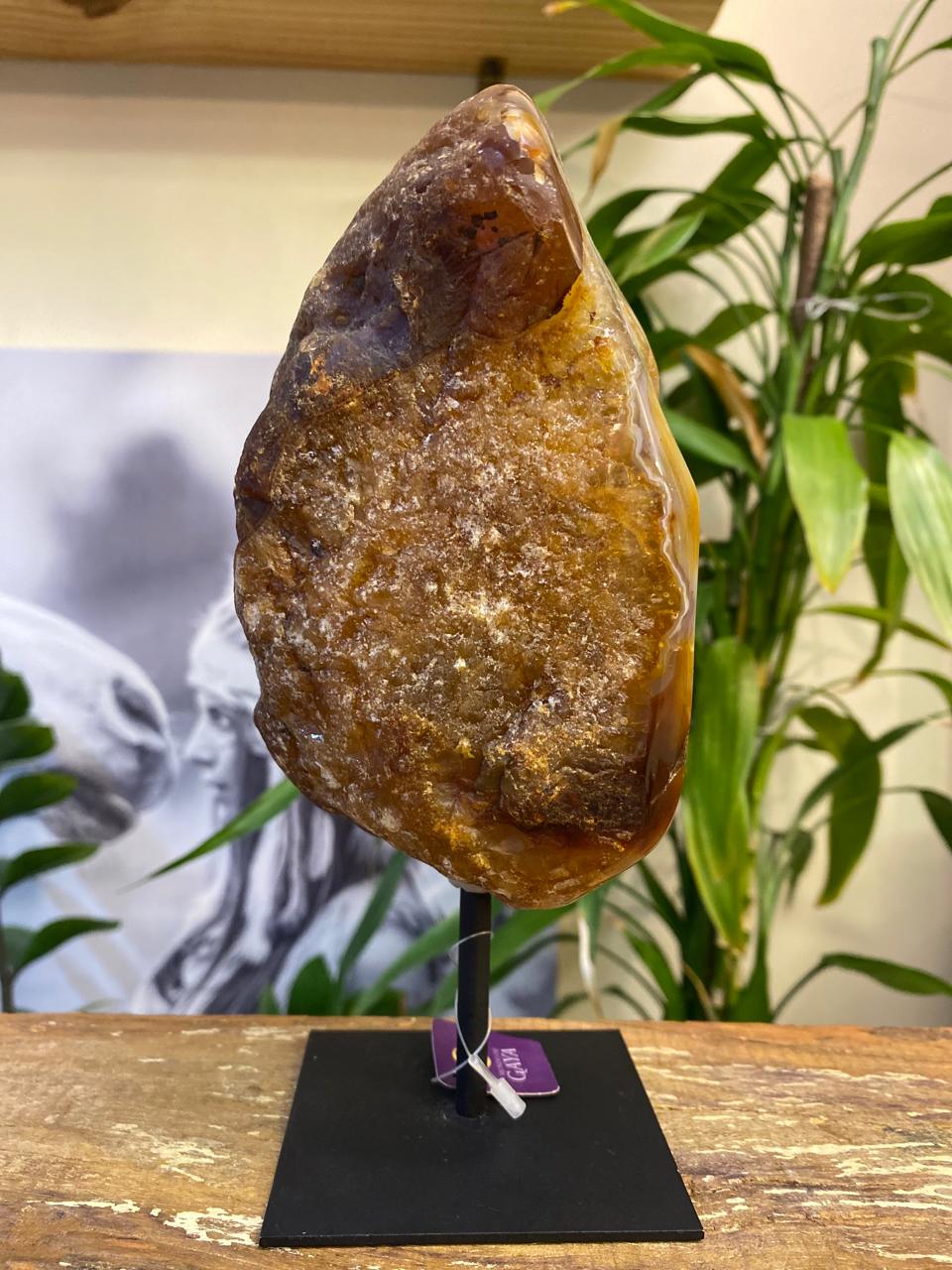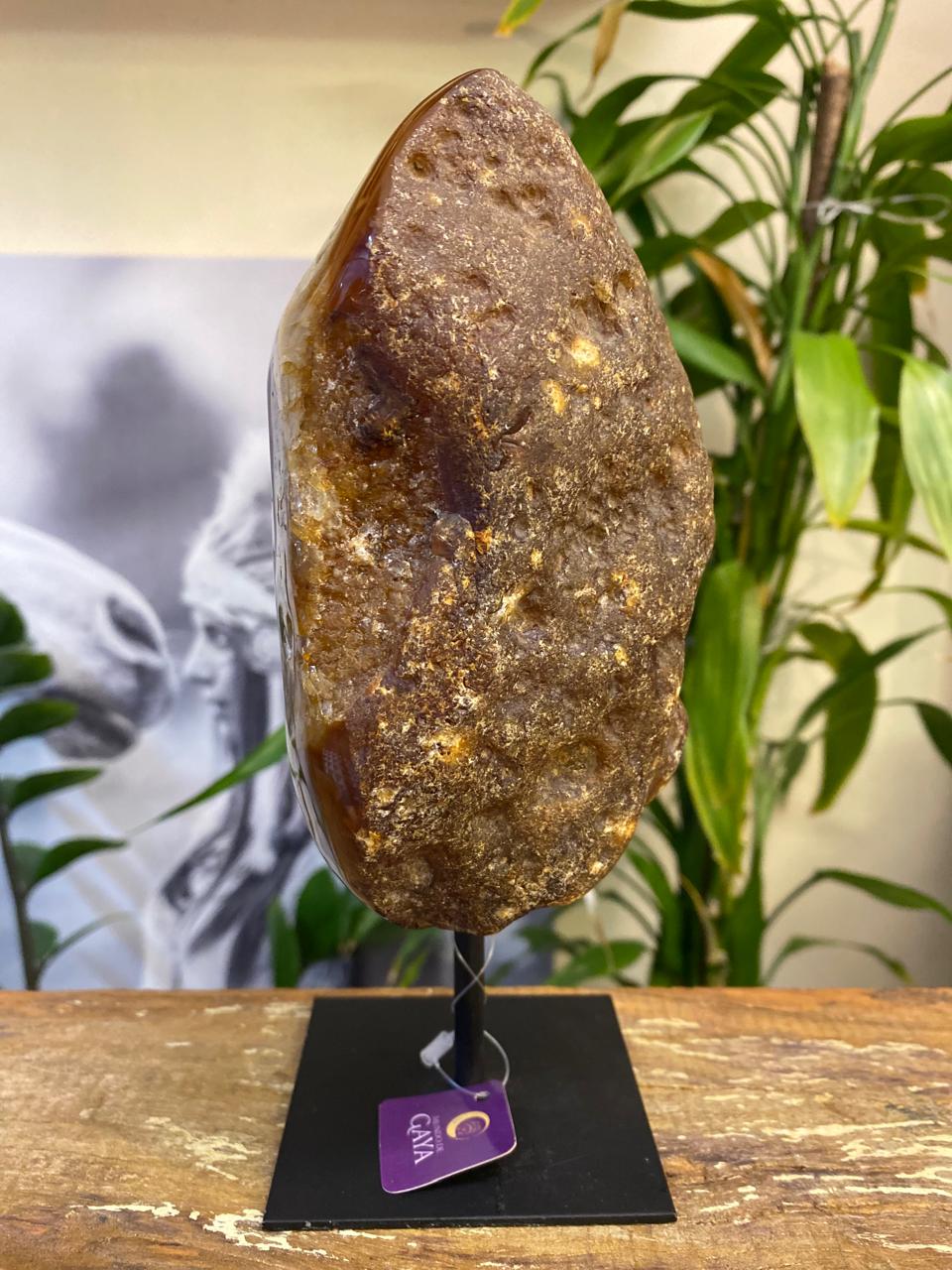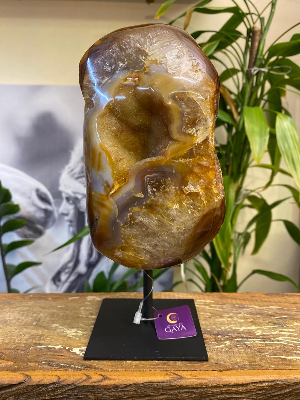 Com tons terrosos e dourados que se entrelaçam de forma natural, essa peça de ágata polida revela uma bela cristalização central que brilha suavemente à luz. O acabamento orgânico valoriza os contornos da pedra, enquanto a base de ferro traz equilíbrio e sofisticação à composição.