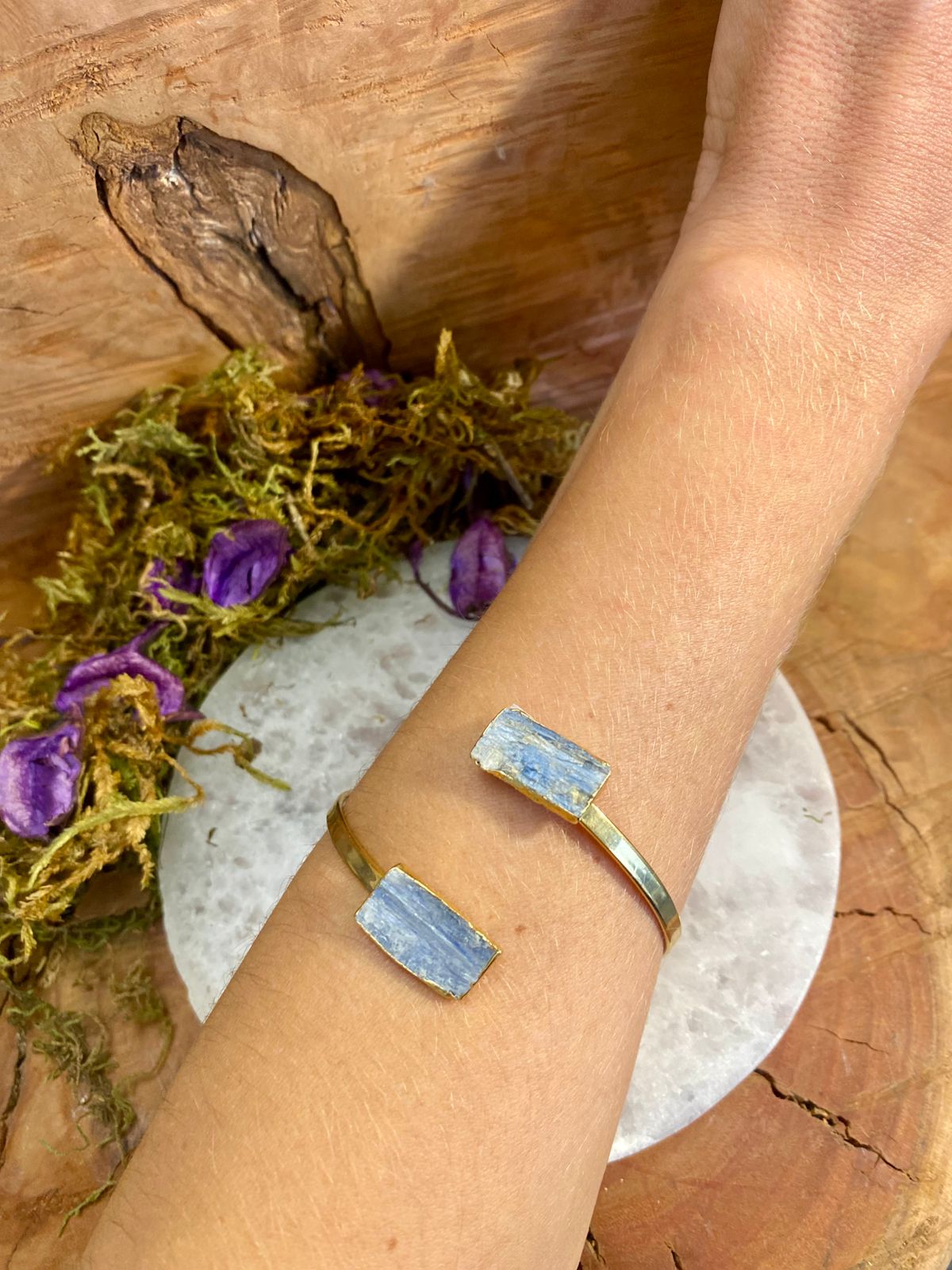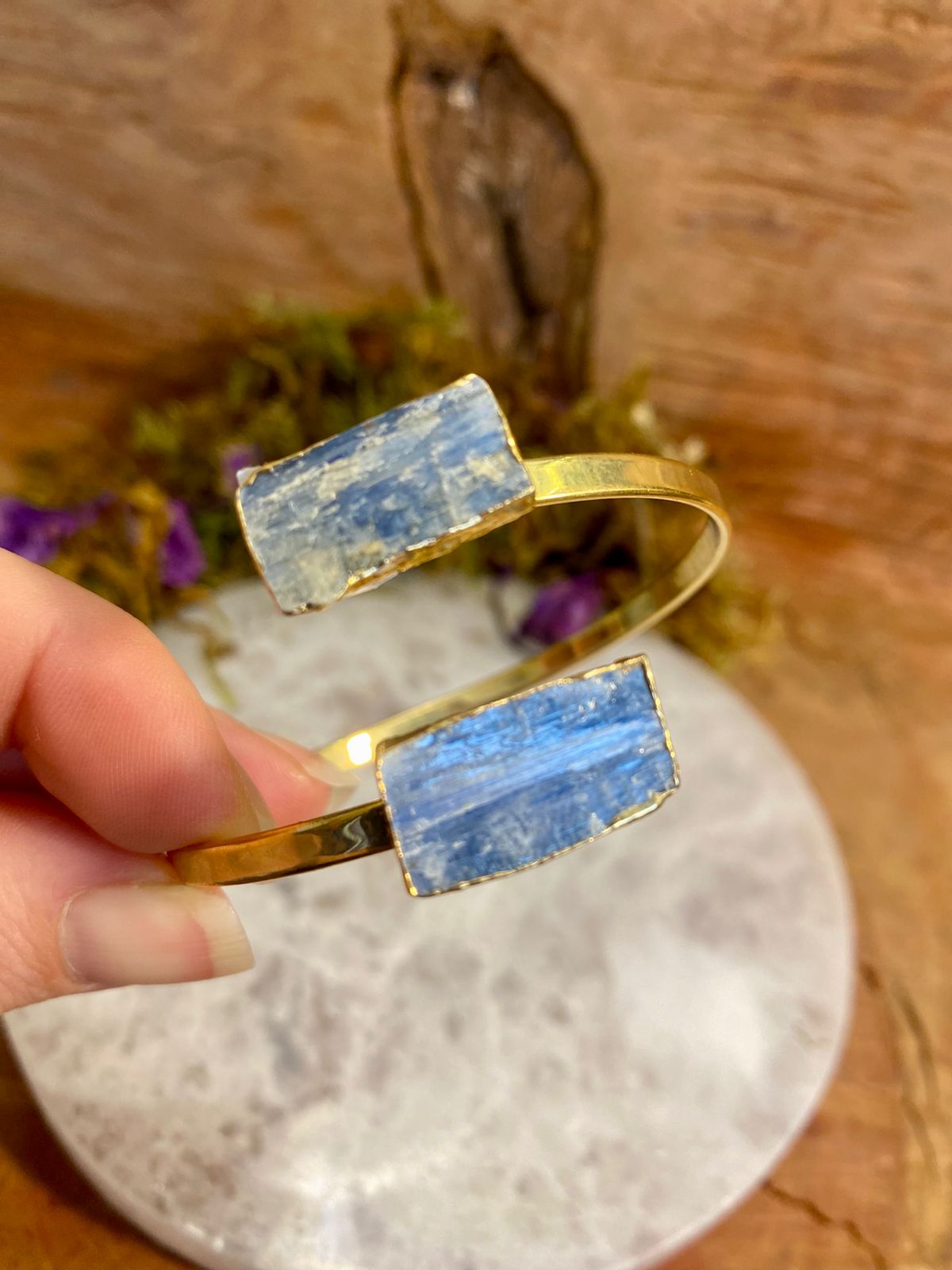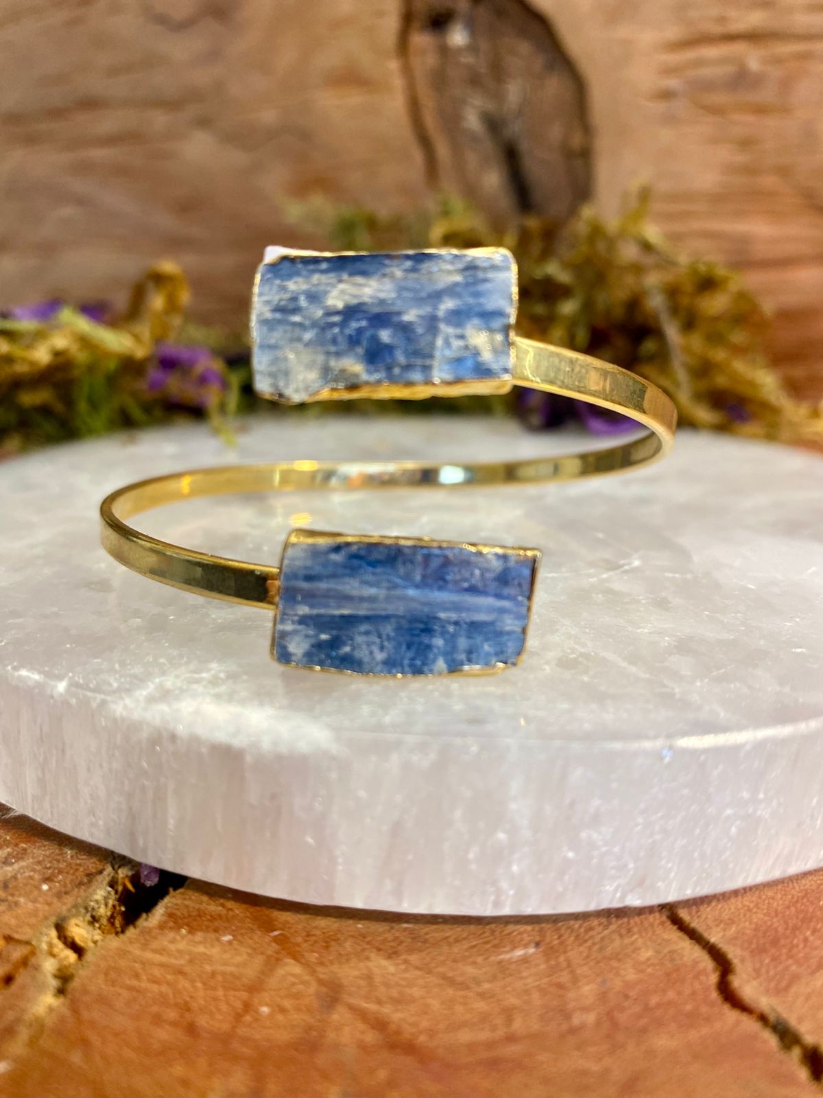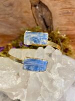 Com duas pedras naturais de cianita azul e acabamento folheado a ouro, este bracelete ajustável foi pensado para ser usado no antebraço, unindo sofisticação e força energética em uma só peça.