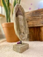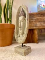 Esta escultura apresenta o busto do Buda com acabamento claro, moldura com textura rústica e detalhes sutis nos cabelos, feitos em tom rosé claro, trazendo um contraste suave e elegante.