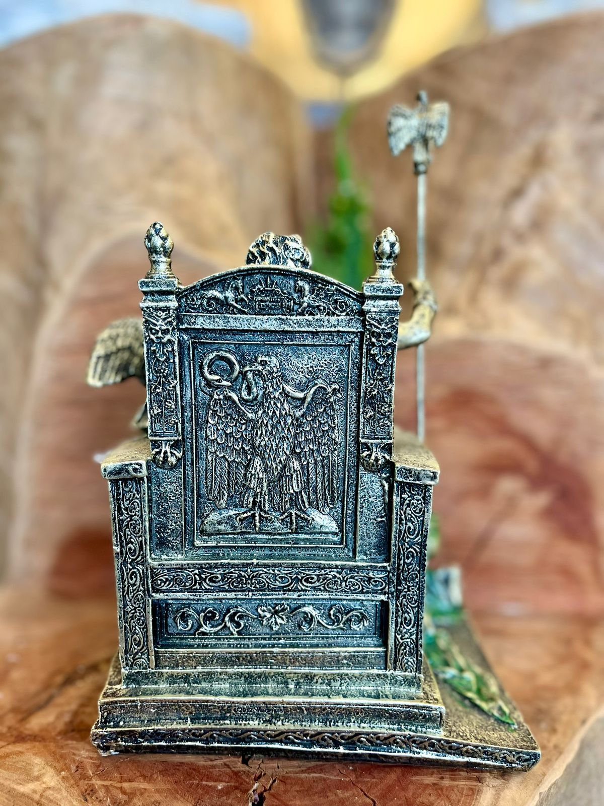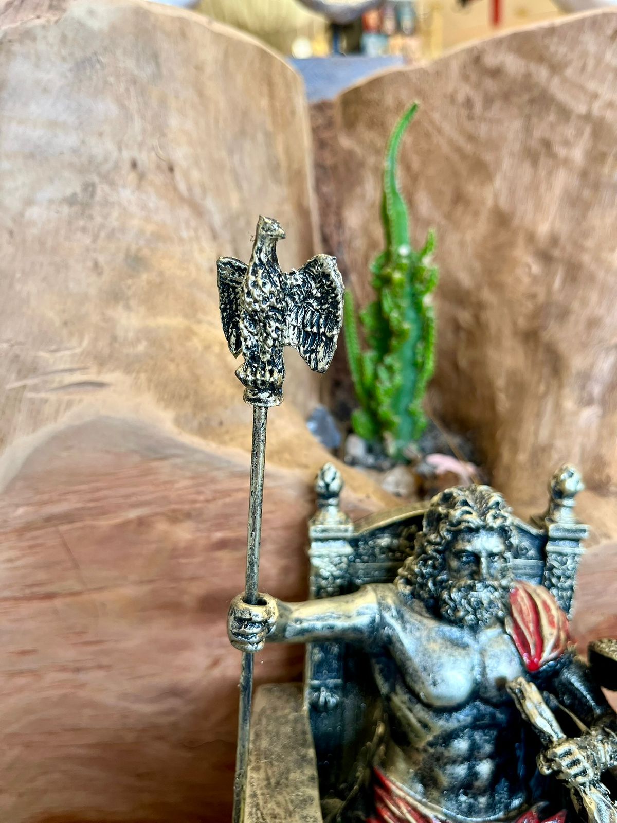 Uma representação imponente de Zeus, o rei dos deuses da mitologia grega, sentado em seu trono com o cetro em uma mão, decorado com uma águia — símbolo de sua autoridade — e na outra, o raio, sua arma mais poderosa e temida.