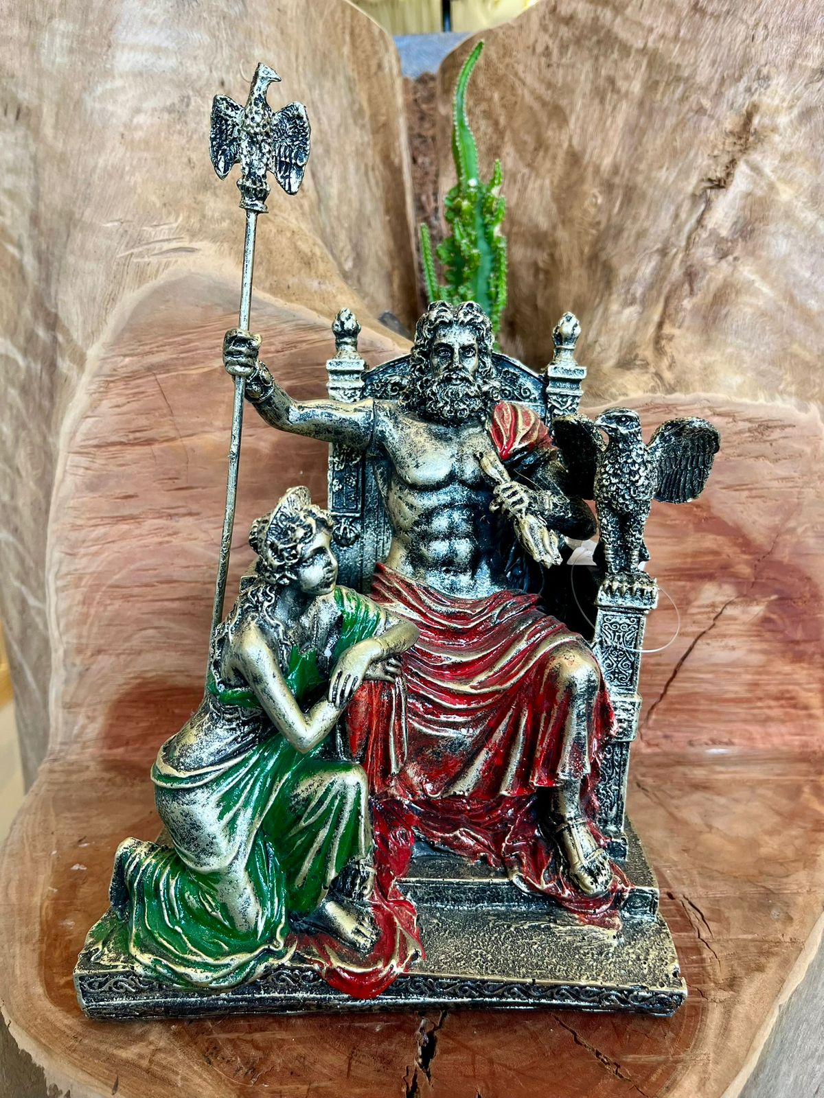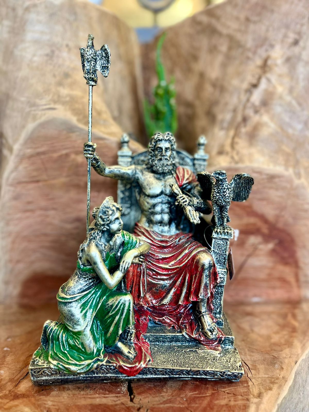 Ao seu lado está Hera, deusa do matrimônio e rainha do Olimpo, ajoelhada com postura firme e serena, demonstrando respeito e união. Juntos, formam o casal mais importante da mitologia grega, representando equilíbrio entre poder e sabedoria.