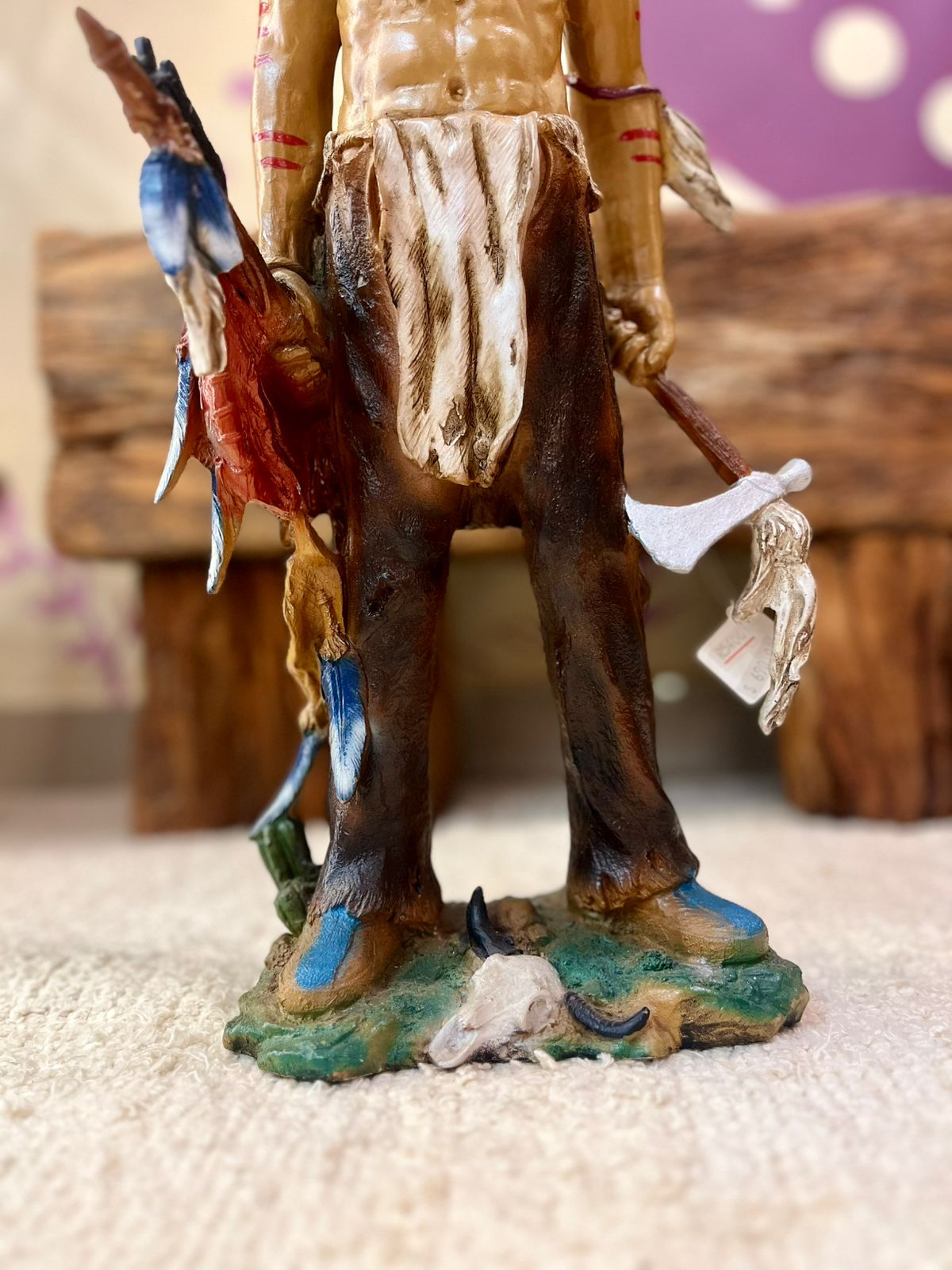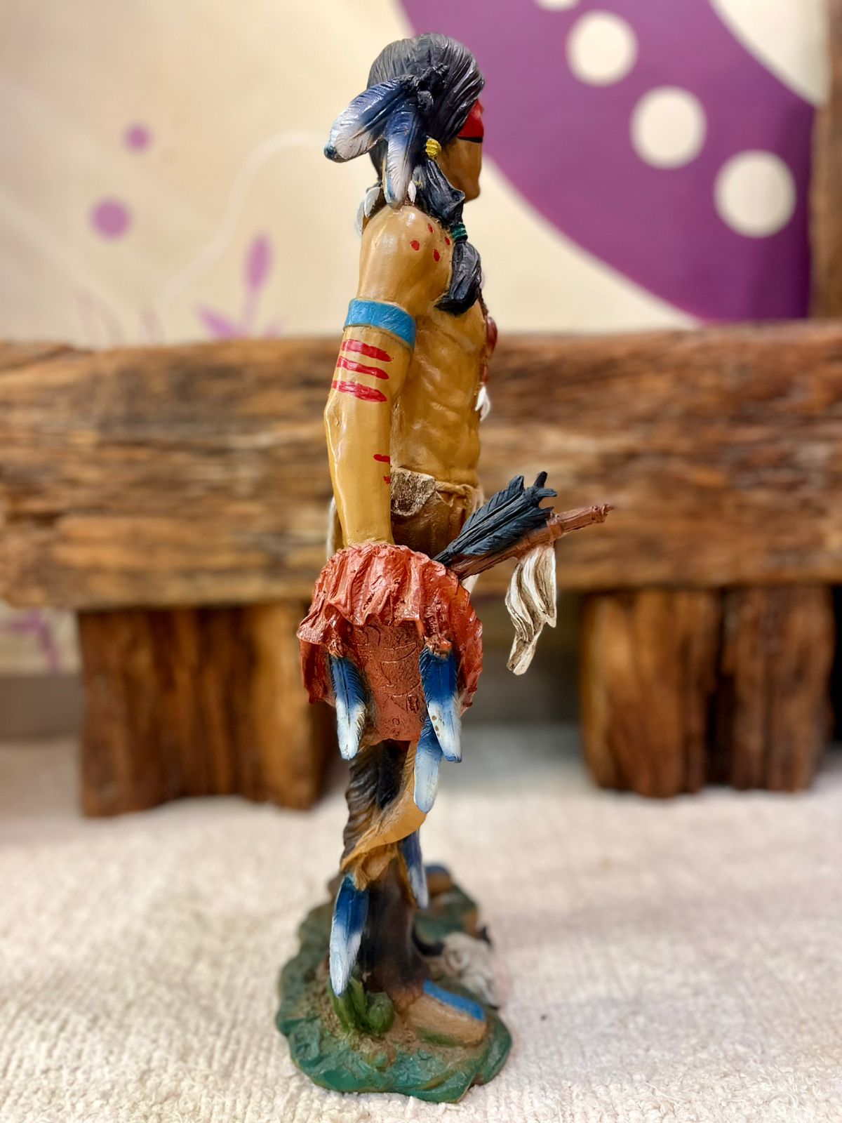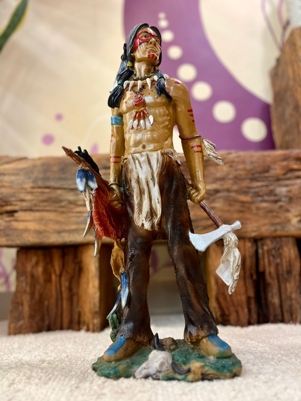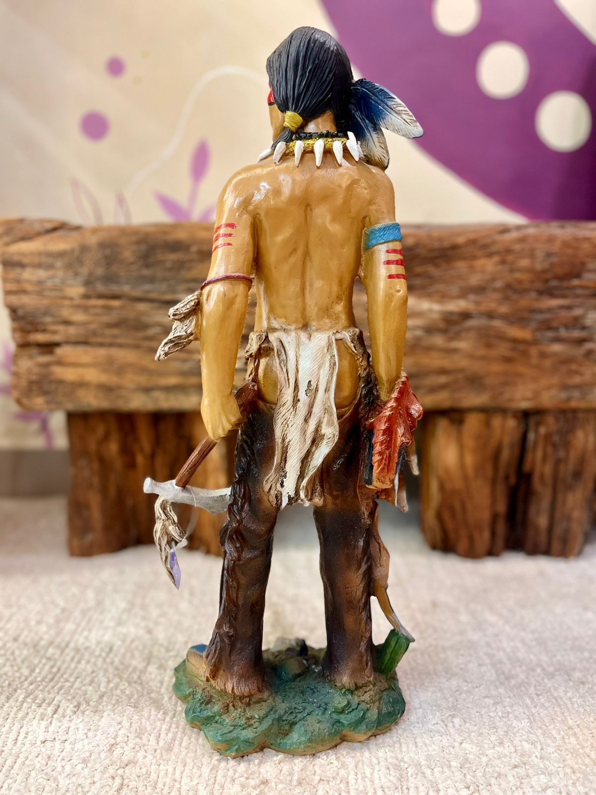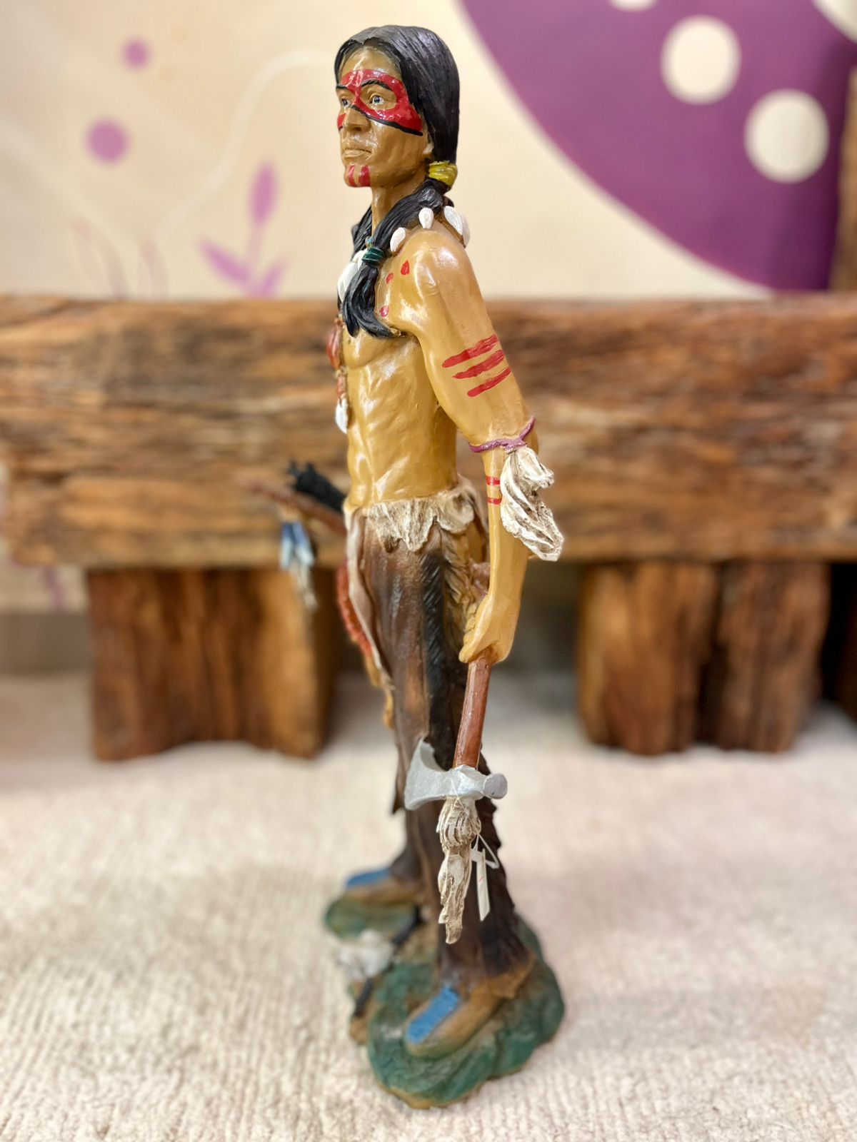 Esta escultura representa um guerreiro indígena norte-americano, em pé, com postura firme e expressão séria. Seu corpo está marcado com pinturas de guerra vermelhas, reforçando seu papel de combatente.