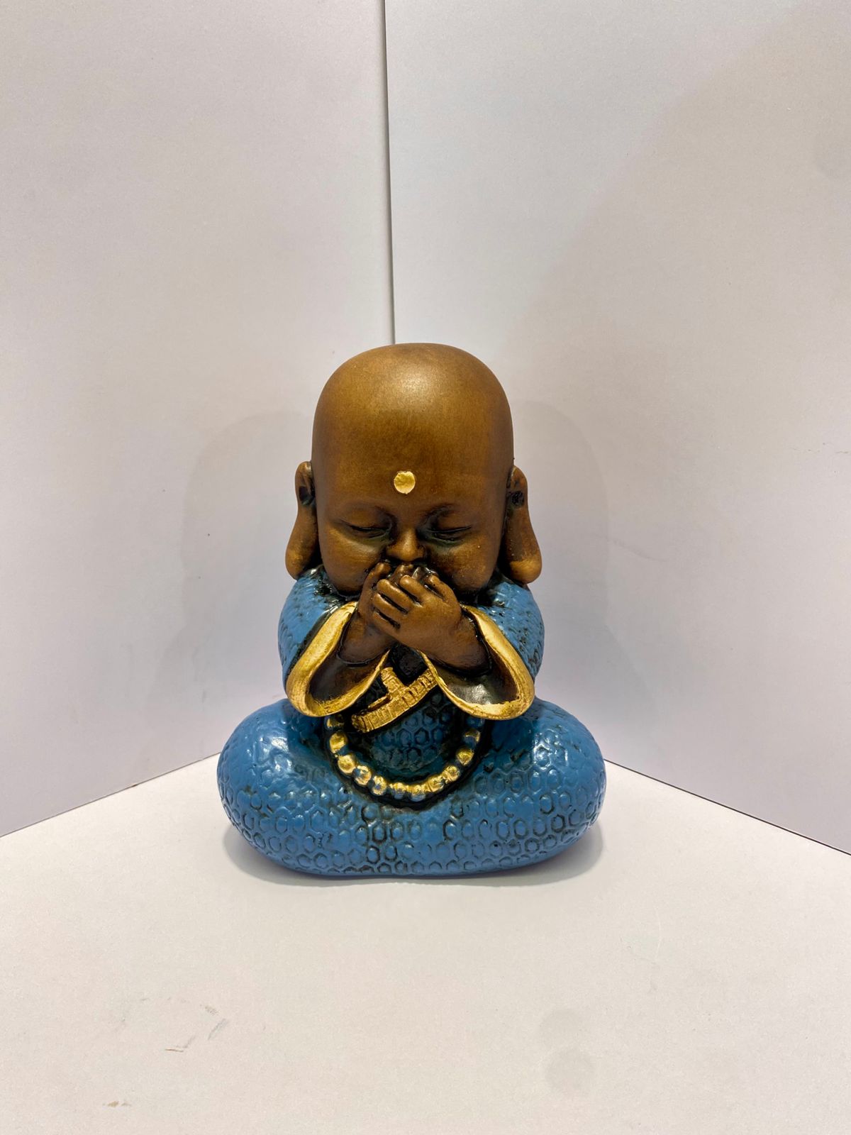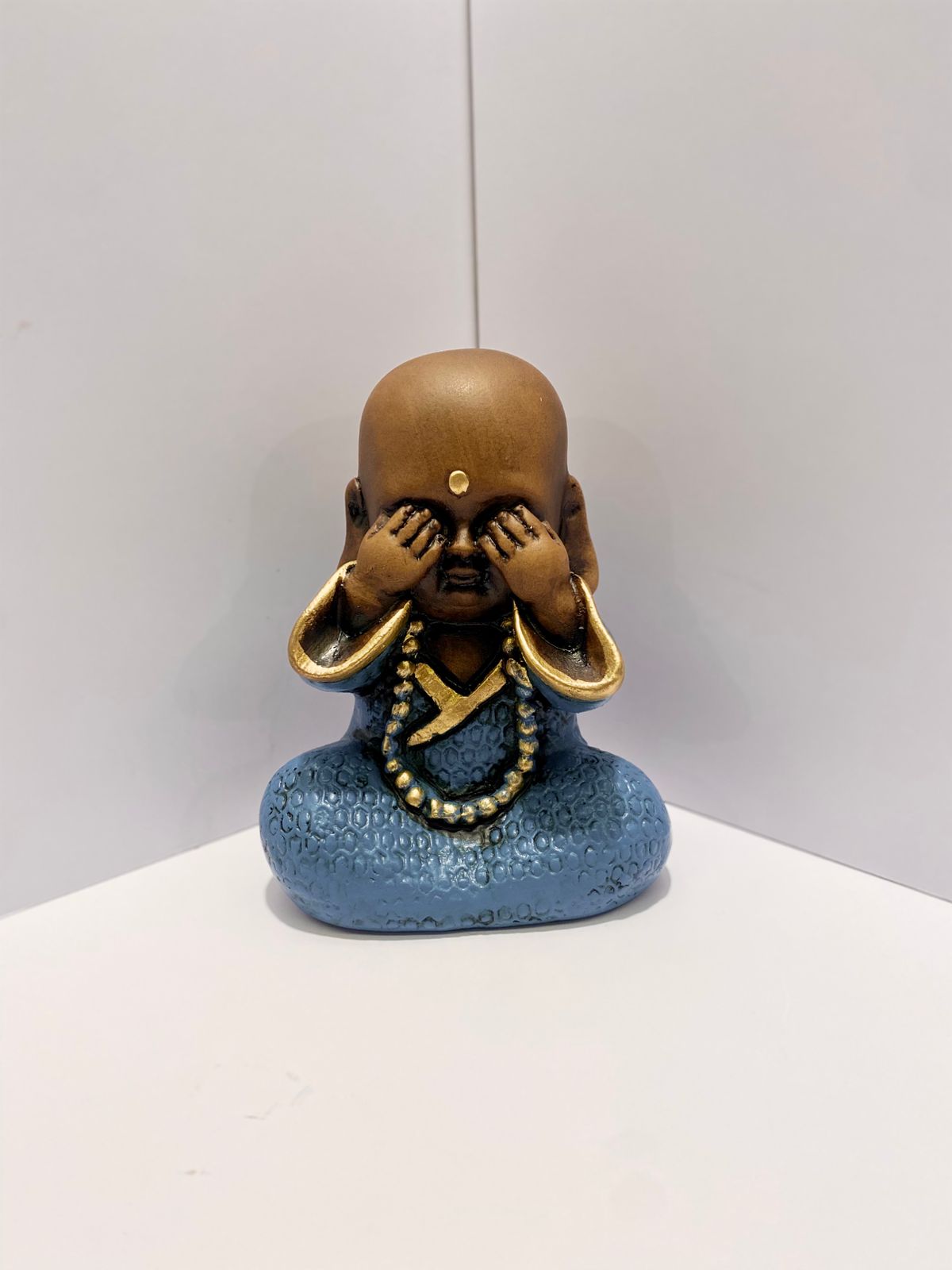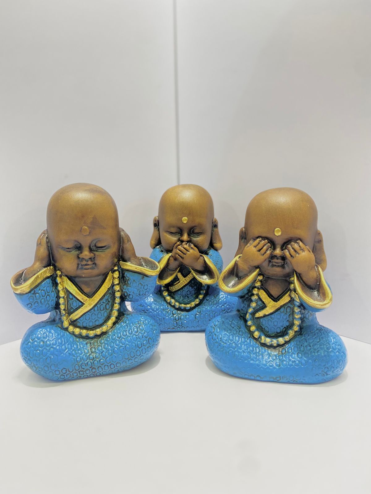 Esse delicado trio de budinhas simboliza a antiga sabedoria oriental expressa nos gestos: Não veja o mal, não ouça o mal, não fale o mal. Feitos em resina, apresentam acabamento detalhado em tom azul com detalhes dourados, transmitindo serenidade, proteção e harmonia para o ambiente.